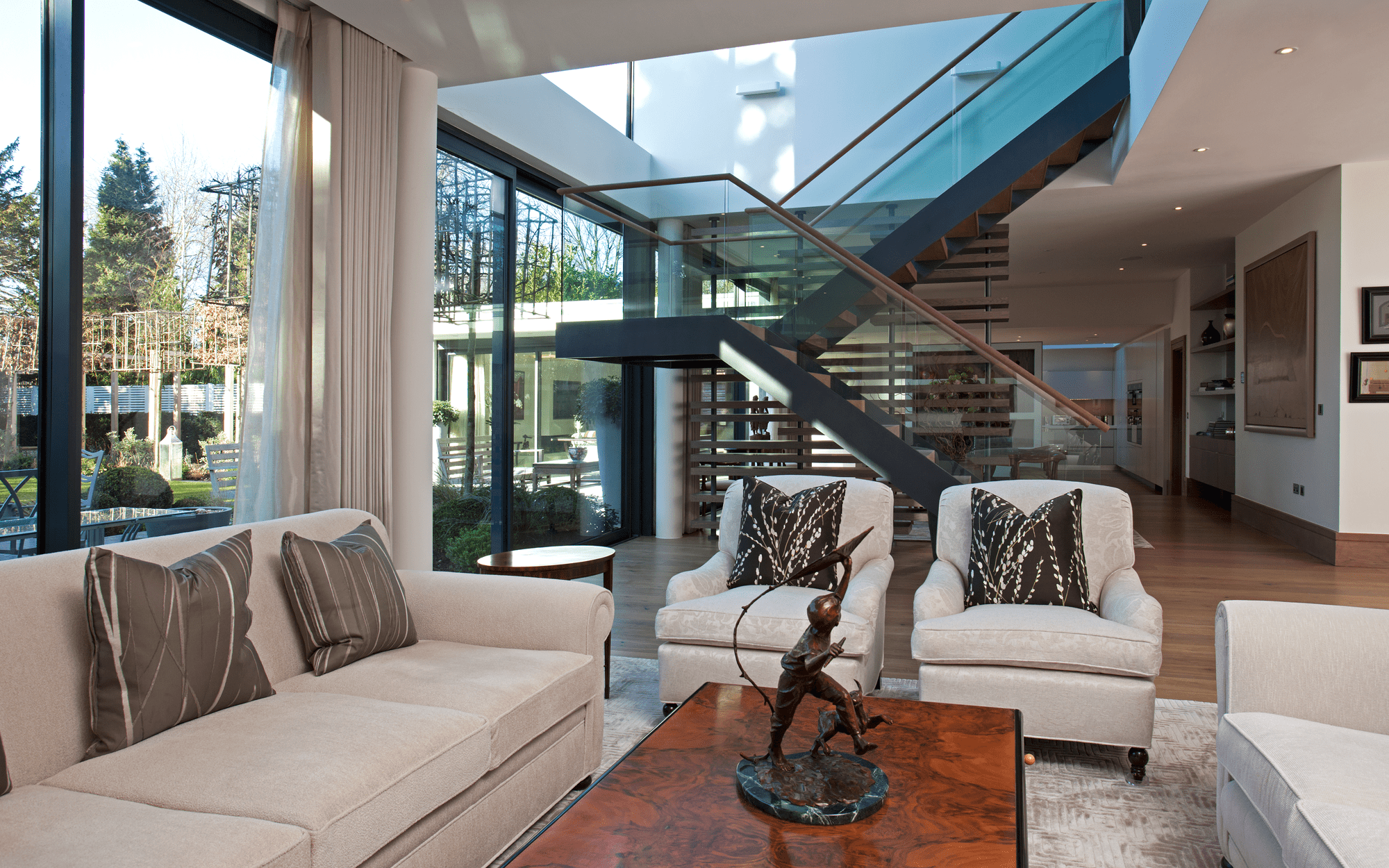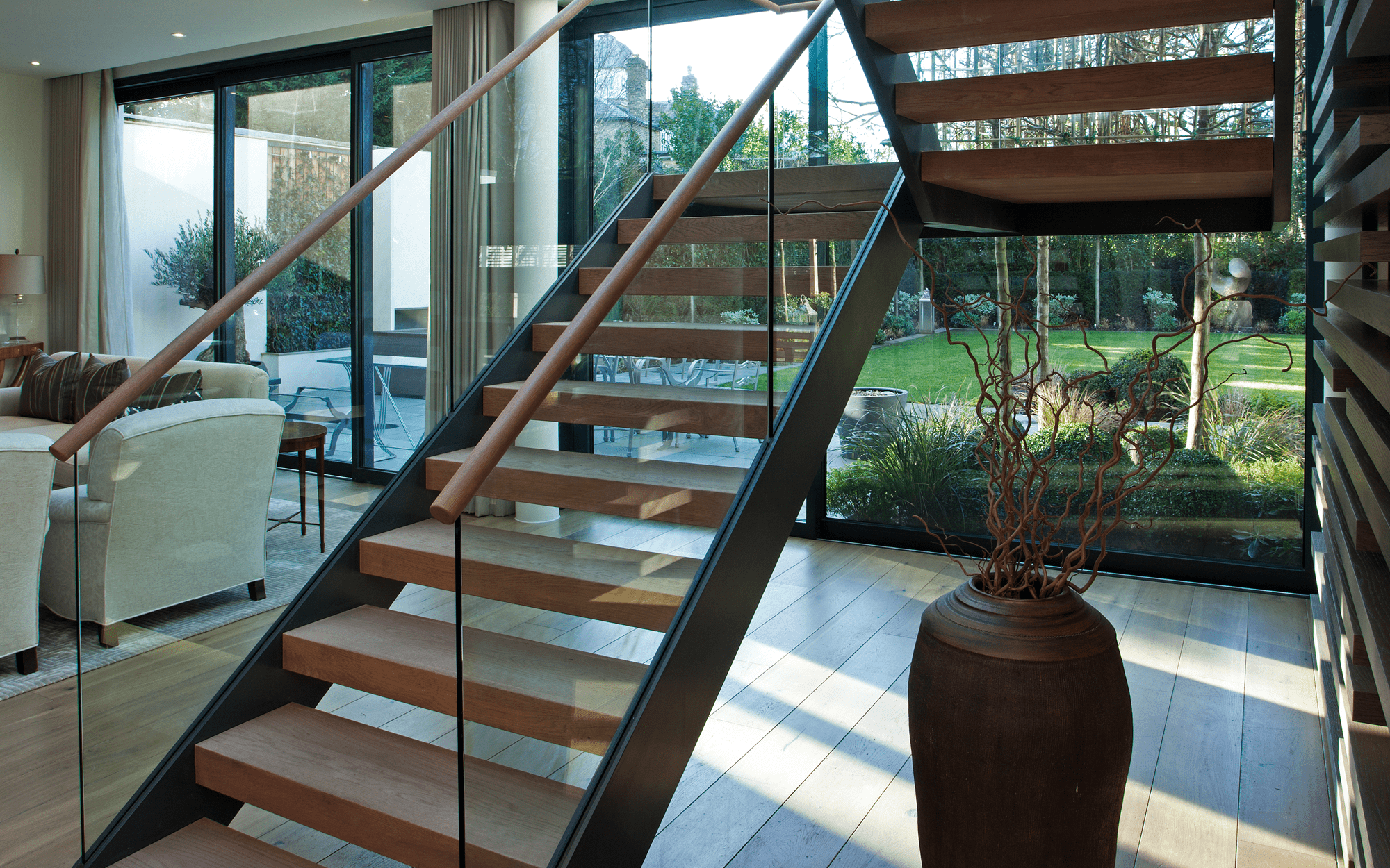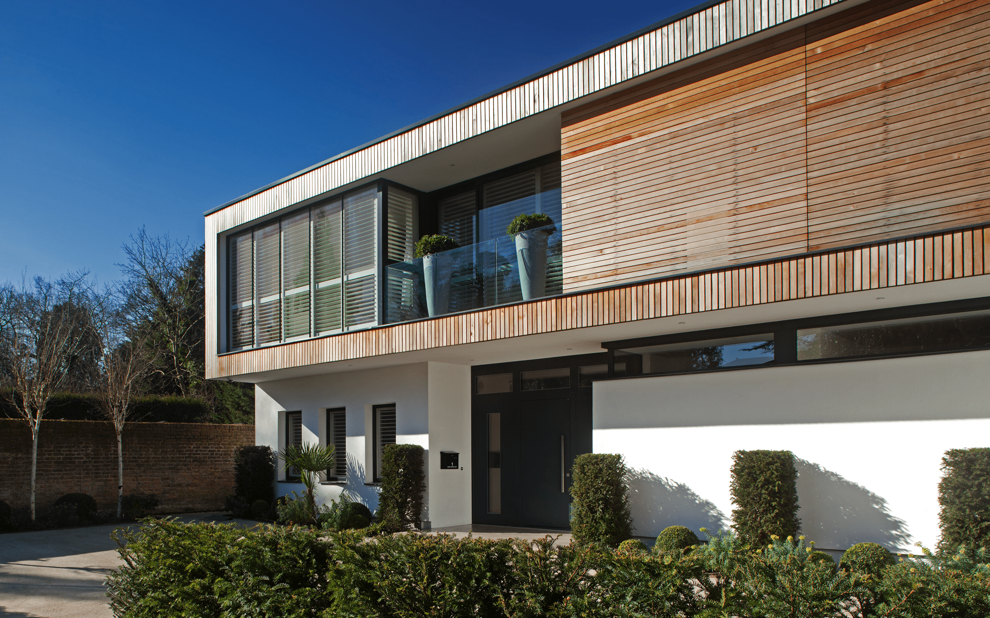 The exterior is finished with fully sustainable Swedish timber. To the rear, large glazed areas open the house up to a south west facing garden.